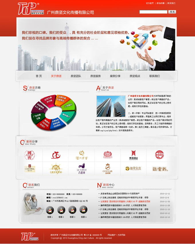 項(xiàng)目名稱(chēng):廣州鼎堅(jiān)文化傳播有限公司網(wǎng)站建設(shè)簽定日期:2010年12月7日廣州鼎堅(jiān)文化傳播有限公司,其前身系廣州星火商業(yè)文案有限公司,主要為廣州及周邊企事業(yè)單位提供品牌傳播、形象宣傳、影視廣告、媒介公關(guān)、文化藝術(shù)交流活動(dòng)等相關(guān)策劃及執(zhí)行,并且