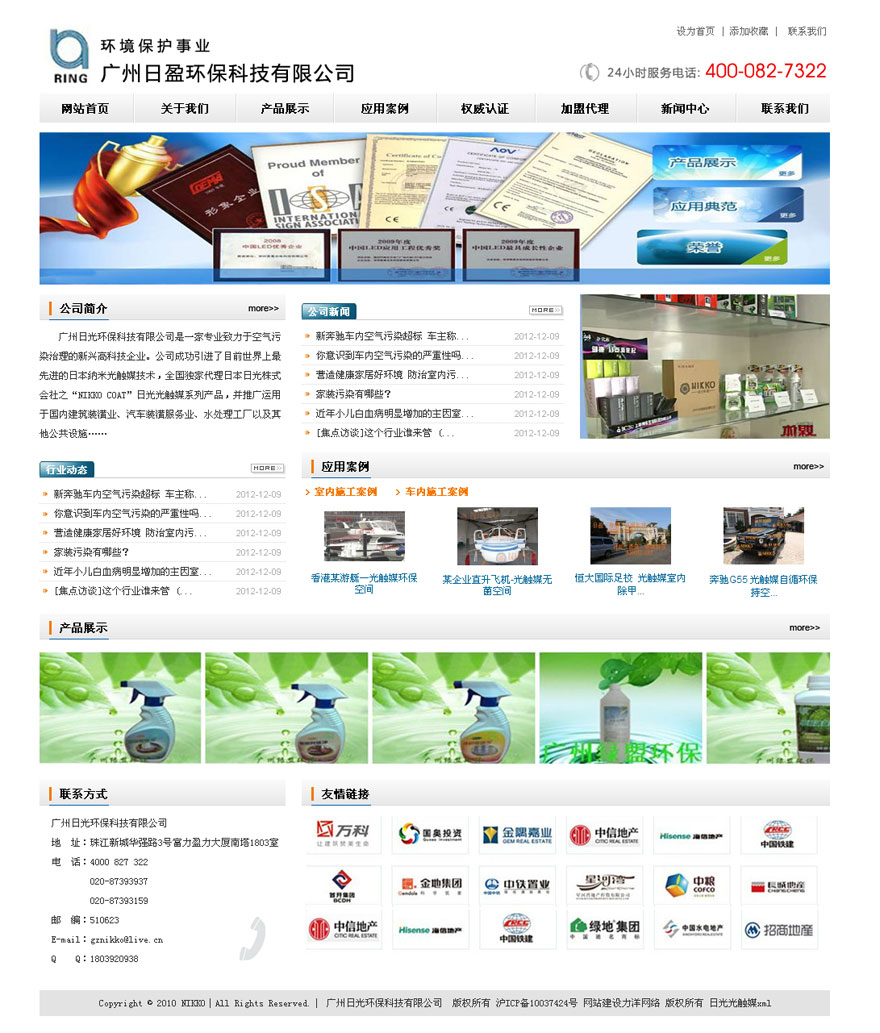 廣州日盈環(huán)??萍加邢薰臼且患覍I(yè)致力于空氣污染治理的新興高科技企業(yè)。公司成功引進了目前世界上最先進的日本納米光觸媒技術(shù),全國獨家代理日本日光株式會社之“NIKKO COAT”日光光觸媒系列產(chǎn)品,并推廣運用于國內(nèi)建筑裝潢業(yè)、汽車裝潢服務(wù)業(yè)、水處理工廠以及其他公共設(shè)施,該系列產(chǎn)品具備持續(xù)、安全、全面、有效的特性從根本上填補了國內(nèi)室內(nèi)環(huán)境全面治理技術(shù)的空白,并先后通過了國家各專業(yè)機構(gòu)的檢測和認證,其各項空氣污染治理指標(biāo)均遠遠領(lǐng)先于國內(nèi)同類產(chǎn)品。