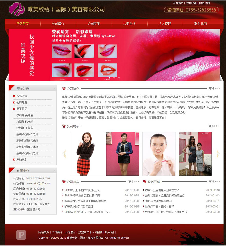 項(xiàng)目名稱(chēng):唯美紋繡(國(guó)際)美容有限公司網(wǎng)站建設(shè)簽定日期:2013年3月25日網(wǎng)址:http://www.szwenxiu.com唯美紋繡(國(guó)際)美容有限公司創(chuàng)立于2008年,源自香港品牌,服務(wù)中國(guó)女性。是一家集紋繡產(chǎn)品研發(fā)、紋繡教育培訓(xùn)、美