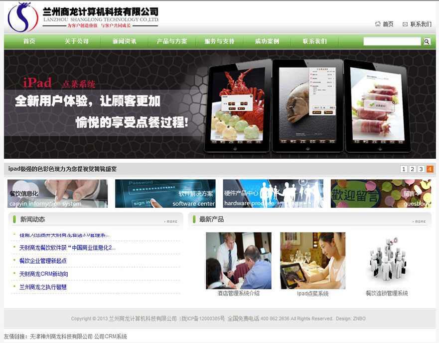 蘭州商龍計(jì)算機(jī)科技有限那公司成立于2006年5月,公司主要涉及酒店餐飲娛樂(lè)及醫(yī)藥行業(yè)的管理軟件、監(jiān)控系統(tǒng)及弱電綜合布線工程。經(jīng)過(guò)六年多的發(fā)展,蘭州商龍成為甘肅地區(qū)最專業(yè)餐飲娛樂(lè)行業(yè)信息化整體解決方案供應(yīng)商,已為200家以上餐飲酒店企業(yè)提供了專業(yè)的信息化服務(wù)(管理軟件,點(diǎn)菜設(shè)備,遠(yuǎn)程監(jiān)控,連鎖管理平臺(tái),會(huì)員CRM管理系統(tǒng)),產(chǎn)品在蘭州地區(qū)的中高端酒店餐飲市場(chǎng)占有率達(dá)70%以上,目前公司成為國(guó)內(nèi)最專業(yè)的酒店餐飲信息化供應(yīng)商天津神州商龍計(jì)算機(jī)科技有限公司甘肅地區(qū)的AAAA級(jí)合作伙伴,成為廣州金博軟件信息有限公司在蘭州地區(qū)的核心代理商,先后為鑫海大酒店,開(kāi)盛海港集團(tuán)、皇家國(guó)宴、狗不理、銀峰、金泰餐飲、火吧餐飲、臨夏濟(jì)民藥業(yè)集團(tuán)等知名企業(yè)提供信息化產(chǎn)品及服務(wù),得到客戶廣泛認(rèn)可,我們致力于通過(guò)我們優(yōu)秀的產(chǎn)品,專業(yè)的實(shí)施隊(duì)伍,穩(wěn)定的售后服務(wù)為甘肅地區(qū)民營(yíng)企業(yè)的飛速發(fā)展保駕護(hù)航!
