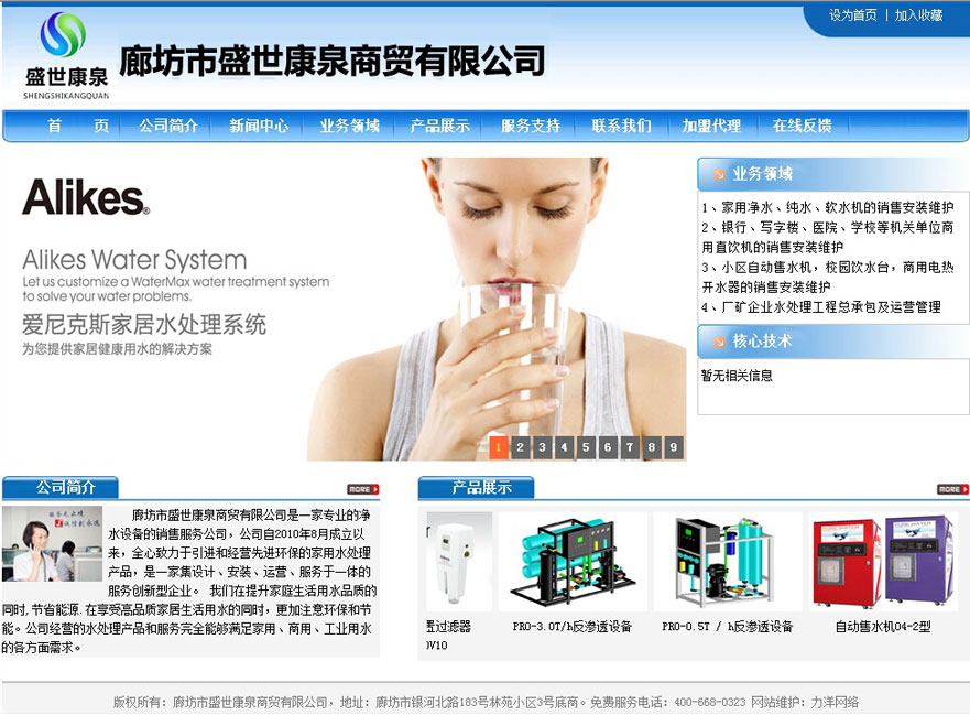 盛世康泉商貿(mào)有限公司代理的水處理品牌在全國(guó)擁有龐大的銷售和服務(wù)網(wǎng)絡(luò),家用機(jī)與國(guó)美電器、大中電器、蘇寧電器,紅星美凱龍、麗都建材城、藍(lán)景麗家等大型電器、建材商城合作,在全國(guó)擁有1500百余家銷售終端,800余家專賣店。本公司的商用機(jī)能夠滿足政府機(jī)關(guān)、銀行、酒店、飯店以及社區(qū)售水機(jī)等全部用水需求;針對(duì)化工廠、醫(yī)院、煤礦以及發(fā)電廠等大型工業(yè)凈水需求,我們?cè)诠こ痰脑O(shè)計(jì)、施工、承包以及運(yùn)營(yíng)維護(hù)方面擁有豐富的經(jīng)驗(yàn)。