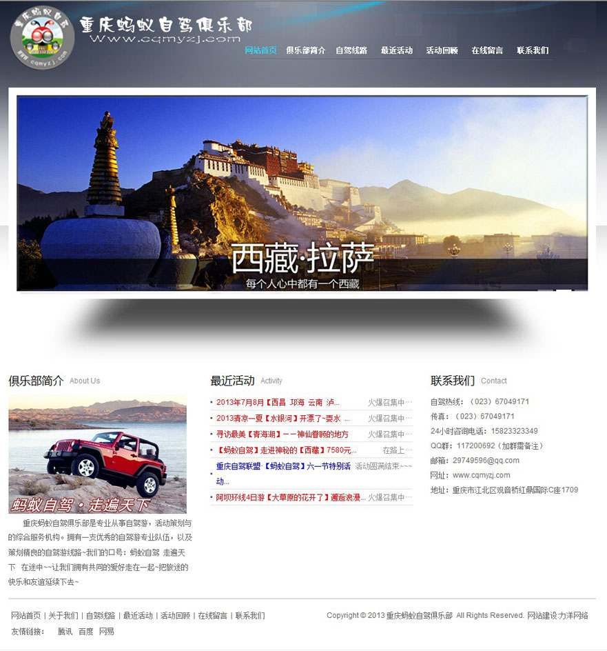 項(xiàng)目名稱:重慶螞蟻?zhàn)择{俱樂(lè)部網(wǎng)站建設(shè)簽定日期:2013年4月19日網(wǎng)址:http://www.cqmyzj.com重慶螞蟻?zhàn)择{俱樂(lè)部活動(dòng)策劃有限公司成立于2006年,是一個(gè)以組織自駕車戶外活動(dòng)策劃為主,其他多種形式戶外活動(dòng)、各類社會(huì)公益活動(dòng)