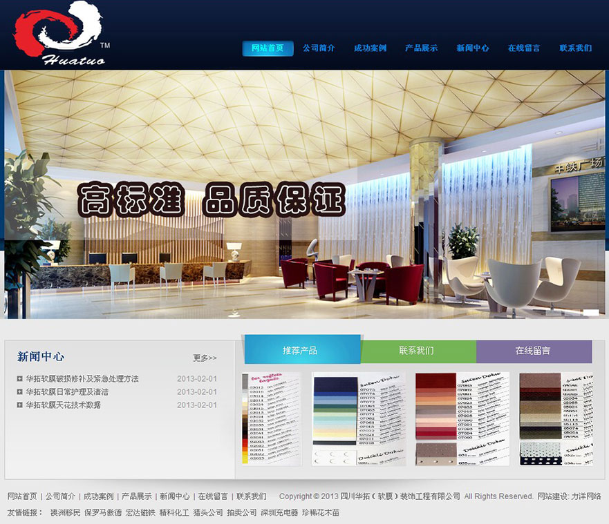 項目名稱:四川華拓裝飾工程網(wǎng)站建設(shè)簽定日期:2013年6月6日網(wǎng)址:http://www.h-tuo.com四川華拓(軟膜)裝飾工程有限公司,成立于2012年,至今公司致力于華拓軟膜天花產(chǎn)品的研發(fā)、銷售及安裝服務(wù)。公司的主要產(chǎn)品包括透光膜、