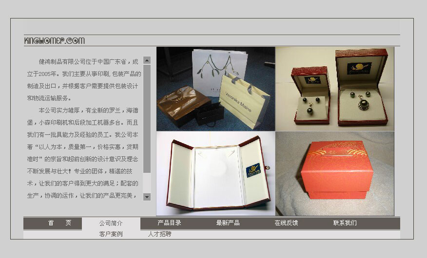 項目名稱:建鴻制品有限公司網(wǎng)站建設(shè)簽定日期:2013年6月19日網(wǎng)址:http://www.kinghomep.com健鴻制品有限公司位于中國廣東省,成立于2005年。我們主要從事印刷,包裝產(chǎn)品的制造及出口,并根據(jù)客戶需要提供包裝設(shè)計和物流